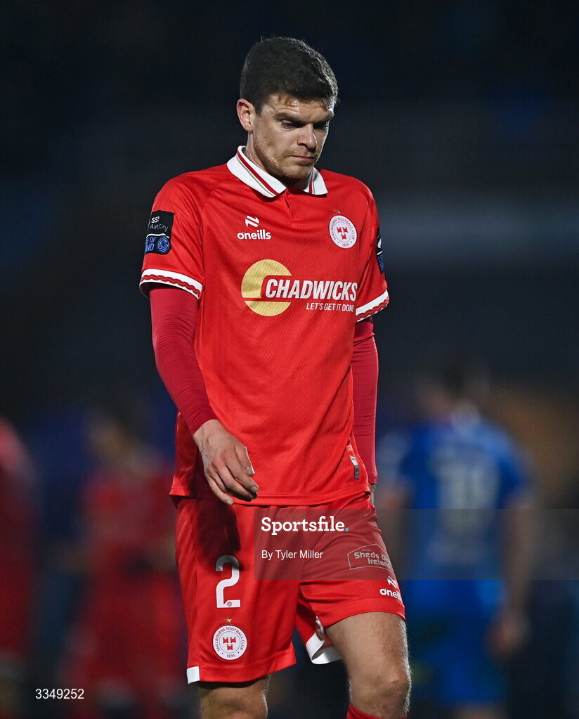 6 February 2026; Sean Gannon of Shelbourne reacts after the SSE Airtricity Men's Premier Division match between Waterford and Shelbourne at the Regional Sports Centre in Waterford. Photo by Tyler Miller/Sportsfile