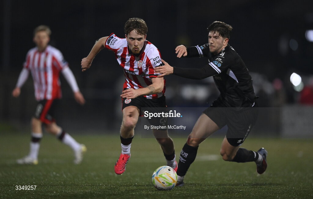 6 February 2026; Alex Bannon of Derry City in action against Seb Quirk of Sligo Rovers during the SSE Airtricity Men's Premier Division match between Derry City and Sligo Rovers at The Ryan McBride Brandywell Stadium in Derry. Photo by Stephen McCarthy/Sportsfile