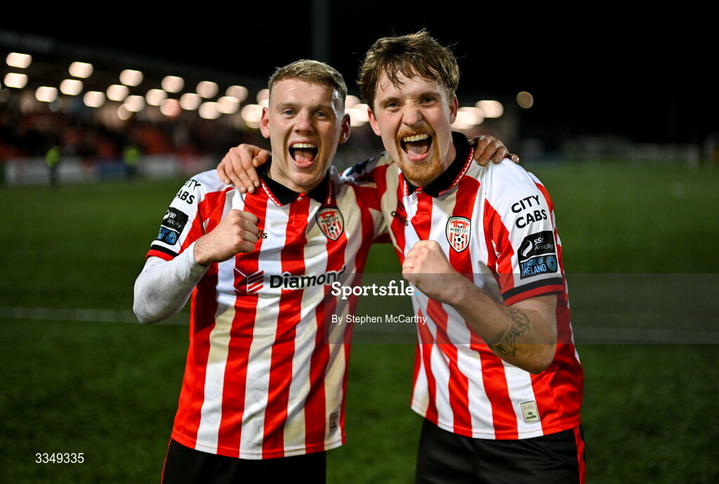 6 February 2026; Derry City goalscorers Josh Thomas, left, and Alex Bannon celebrate after the SSE Airtricity Men's Premier Division match between Derry City and Sligo Rovers at The Ryan McBride Brandywell Stadium in Derry. Photo by Stephen McCarthy/Sportsfile