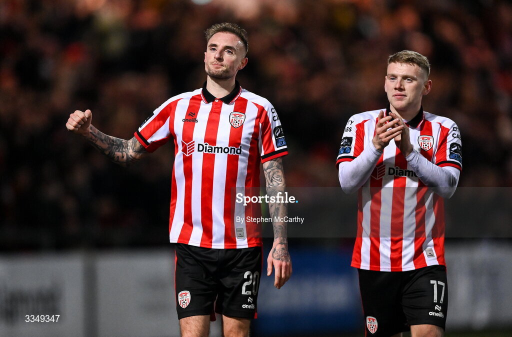 6 February 2026; Carl Winchester, left, and Josh Thomas of Derry City celebrate after the SSE Airtricity Men's Premier Division match between Derry City and Sligo Rovers at The Ryan McBride Brandywell Stadium in Derry. Photo by Stephen McCarthy/Sportsfile