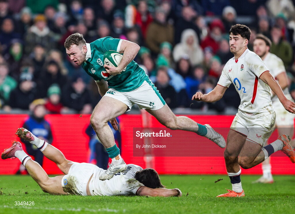 6 February 2026; Cathal Forde of Ireland during the representative fixture rugby union match between Ireland XV and England A at Thomond Park in Limerick. Photo by John Dickson/Sportsfile