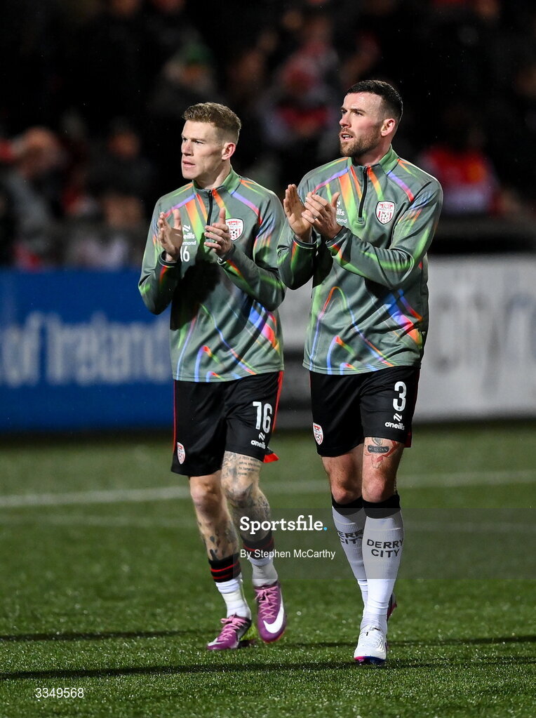 6 February 2026; Patrick McClean, right, and James McClean of Derry City before the SSE Airtricity Men's Premier Division match between Derry City and Sligo Rovers at The Ryan McBride Brandywell Stadium in Derry. Photo by Stephen McCarthy/Sportsfile