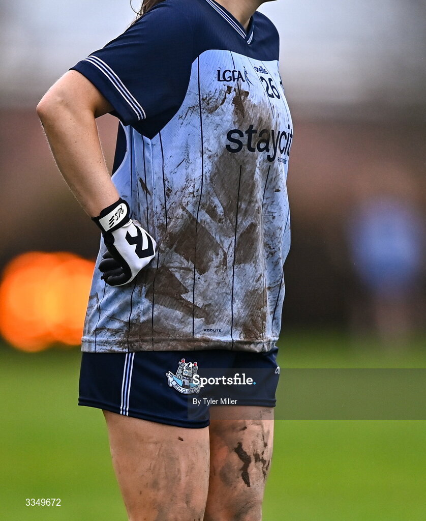 7 February 2026; Mud is seen on a Dublin jersey during the Lidl Ladies National Football League Division 1 Round 3 match between Waterford and Dublin at Dungarvan GAA Club in Dungarvan, Waterford. Photo by Tyler Miller/Sportsfile