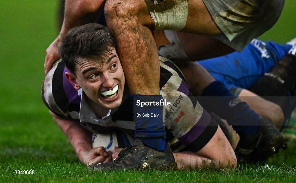 7 February 2026; Craig Adams of Terenure College scores his side's first try during the Energia All-Ireland League Men's Division 1A match between St Mary's College and Terenure College at Templeville Road in Dublin. Photo by Seb Daly/Sportsfile
