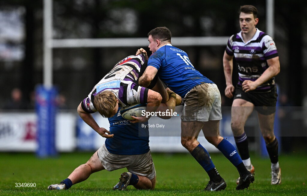 7 February 2026; Max Russell of Terenure College is tackled by St Mary's College players Jack Nelson, left, and Mick O’Gara during the Energia All-Ireland League Men's Division 1A match between St Mary's College and Terenure College at Templeville Road in Dublin. Photo by Seb Daly/Sportsfile