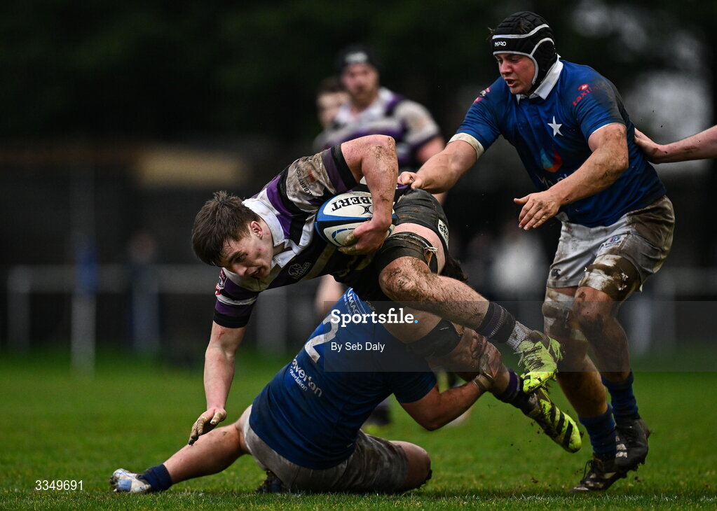 7 February 2026; William Hickey of Terenure College is tackled by Jack Nelson of St Mary’s College during the Energia All-Ireland League Men's Division 1A match between St Mary's College and Terenure College at Templeville Road in Dublin. Photo by Seb Daly/Sportsfile