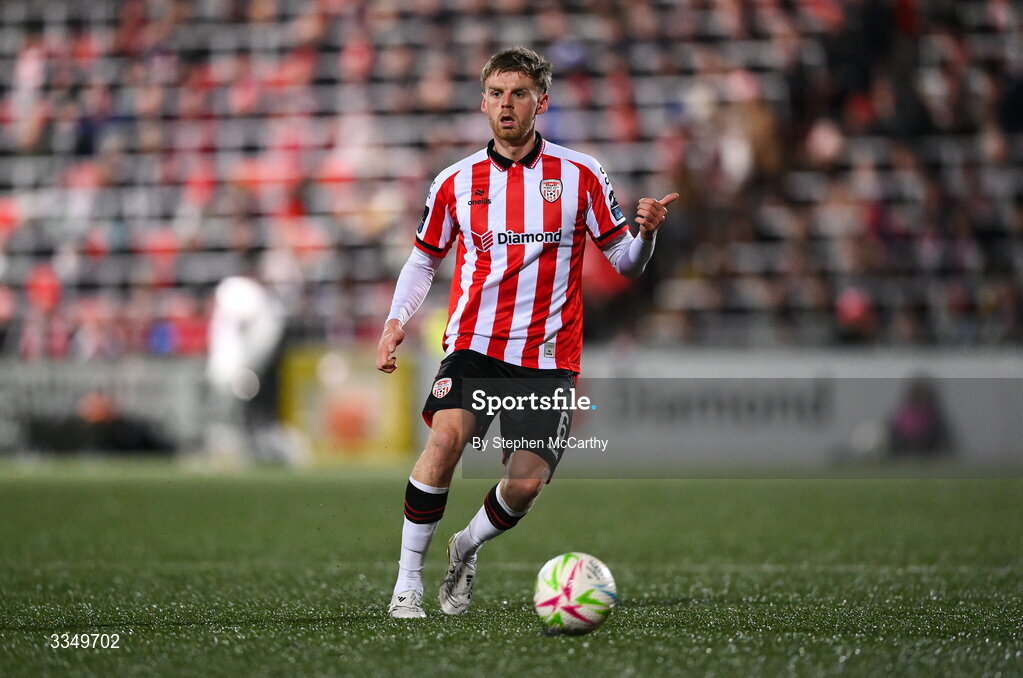 6 February 2026; Rob Slevin of Derry City during the SSE Airtricity Men's Premier Division match between Derry City and Sligo Rovers at The Ryan McBride Brandywell Stadium in Derry. Photo by Stephen McCarthy/Sportsfile