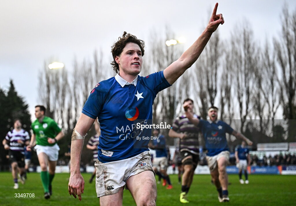 7 February 2026; Myles Carey of St Mary’s College celebrates after scoring his side's third try during the Energia All-Ireland League Men's Division 1A match between St Mary's College and Terenure College at Templeville Road in Dublin. Photo by Seb Daly/Sportsfile