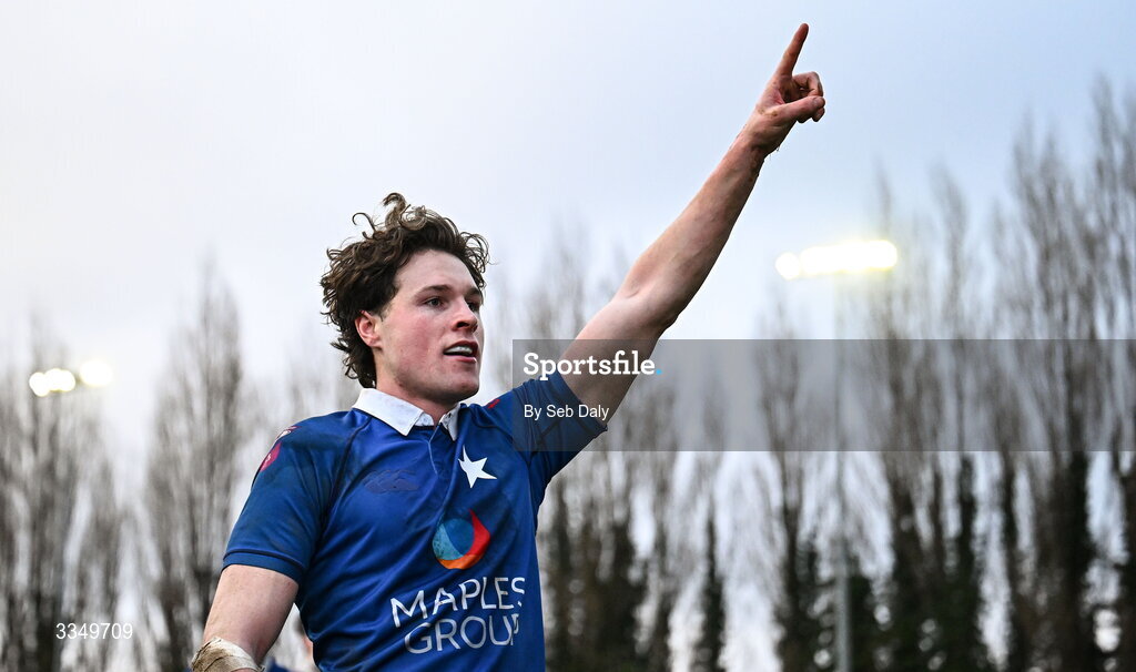 7 February 2026; Myles Carey of St Mary’s College celebrates after scoring his side's third try during the Energia All-Ireland League Men's Division 1A match between St Mary's College and Terenure College at Templeville Road in Dublin. Photo by Seb Daly/Sportsfile