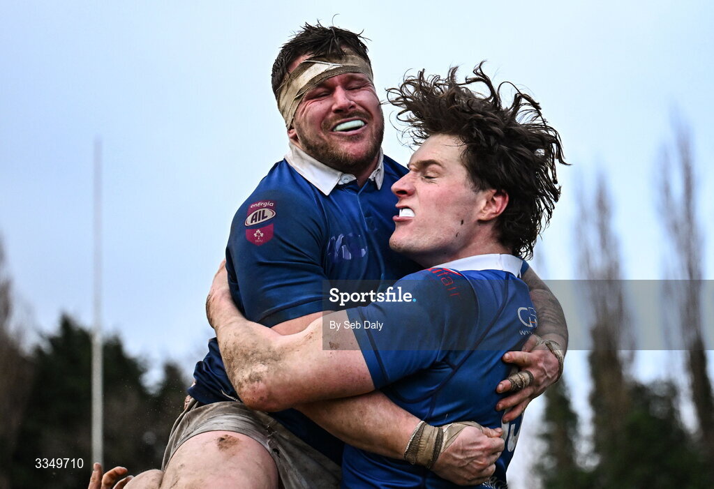 7 February 2026; Myles Carey of St Mary’s College, right, celebrates with teammate Mick McCormack after scoring their side's third try during the Energia All-Ireland League Men's Division 1A match between St Mary's College and Terenure College at Templeville Road in Dublin. Photo by Seb Daly/Sportsfile