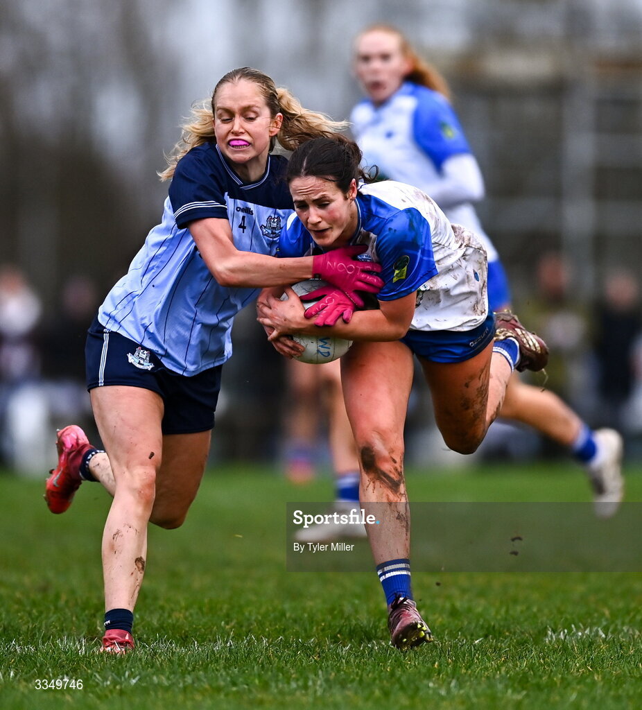 7 February 2026; Áine O'Neill of Waterford in action against Keeva Kenehan of Dublin during the Lidl Ladies National Football League Division 1 Round 3 match between Waterford and Dublin at Dungarvan GAA Club in Dungarvan, Waterford. Photo by Tyler Miller/Sportsfile