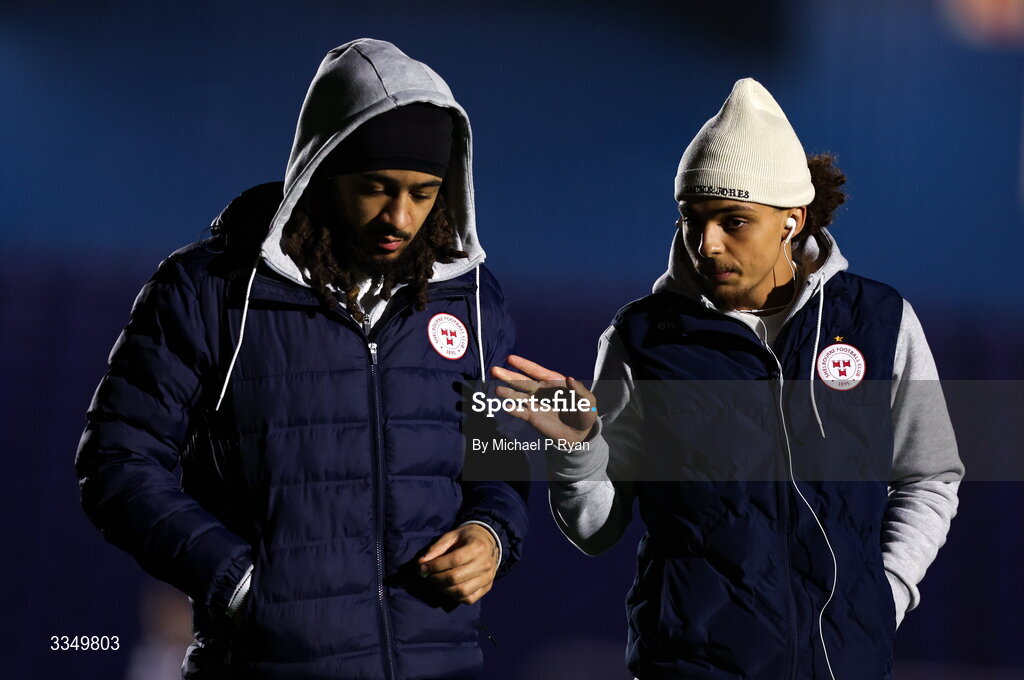 6 February 2026; Milan Mbeng, left, and Maill Lundgren of Shelbourne before the SSE Airtricity Men's Premier Division match between Waterford and Shelbourne at the Regional Sports Centre in Waterford. Photo by Michael P Ryan/Sportsfile