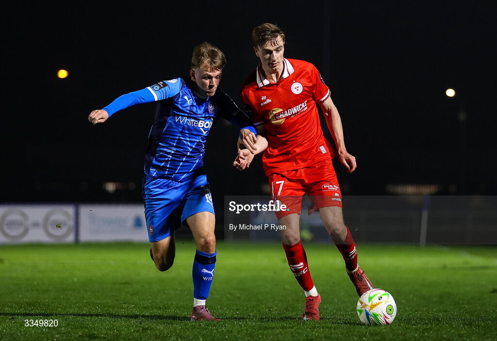 6 February 2026; Daniel Kelly of Shelbourne in action against Conan Noonan of Waterford during the SSE Airtricity Men's Premier Division match between Waterford and Shelbourne at the Regional Sports Centre in Waterford. Photo by Michael P Ryan/Sportsfile