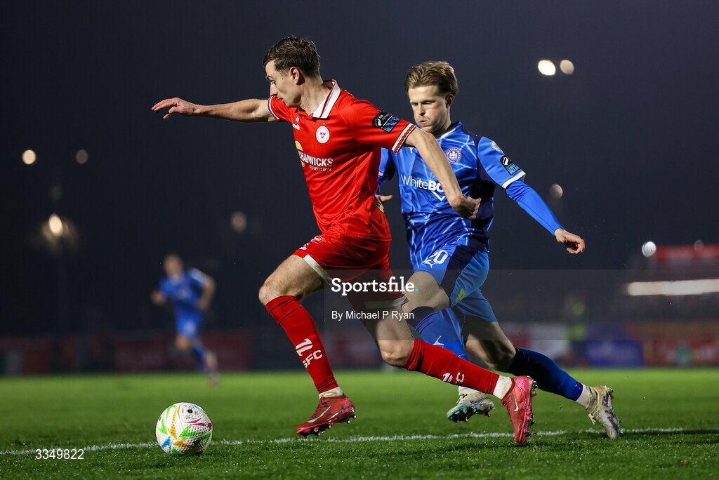 6 February 2026; Daniel Kelly of Shelbourne in action against Jorgen Voilas of Waterford during the SSE Airtricity Men's Premier Division match between Waterford and Shelbourne at the Regional Sports Centre in Waterford. Photo by Michael P Ryan/Sportsfile