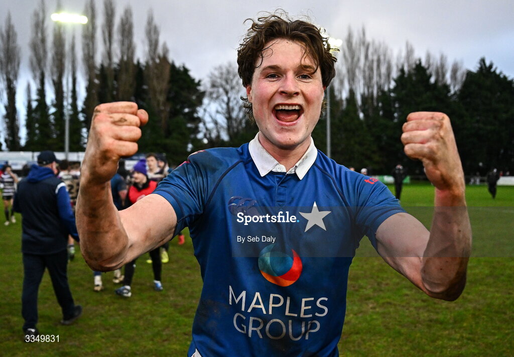 7 February 2026; Myles Carey of St Mary’s College celebrates after his side's victory in the Energia All-Ireland League Men's Division 1A match between St Mary's College and Terenure College at Templeville Road in Dublin. Photo by Seb Daly/Sportsfile