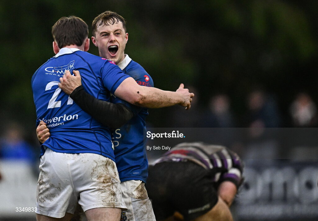 7 February 2026; St Mary's College players Colm Reilly, right, and Zack Hopkins celebrate after their side's victory in the Energia All-Ireland League Men's Division 1A match between St Mary's College and Terenure College at Templeville Road in Dublin. Photo by Seb Daly/Sportsfile