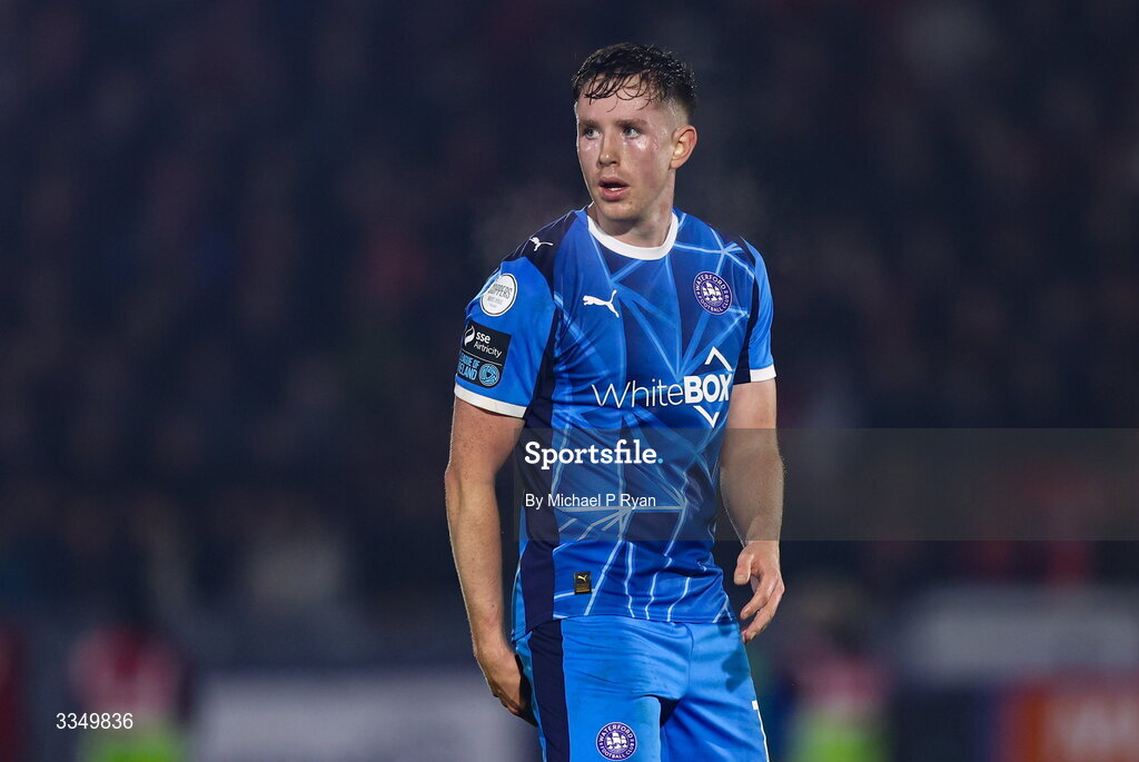 6 February 2026; Sam Glenfield of Waterford during the SSE Airtricity Men's Premier Division match between Waterford and Shelbourne at the Regional Sports Centre in Waterford. Photo by Michael P Ryan/Sportsfile