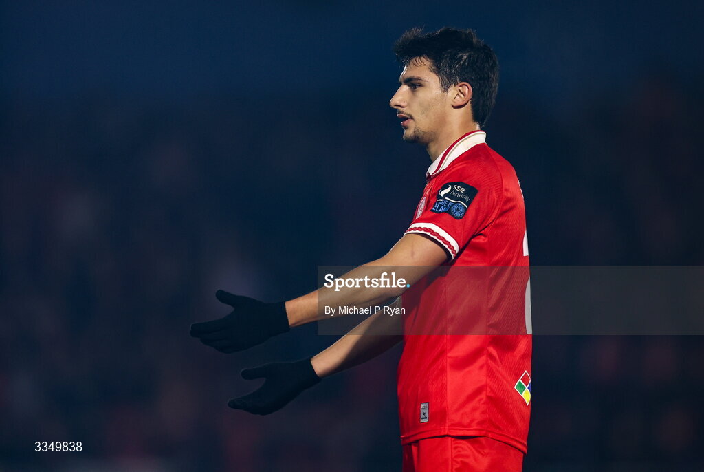 6 February 2026; Rodrigo Freitas of Shelbourne during the SSE Airtricity Men's Premier Division match between Waterford and Shelbourne at the Regional Sports Centre in Waterford. Photo by Michael P Ryan/Sportsfile