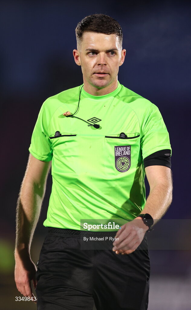 6 February 2026; Referee Lucas Keating during the SSE Airtricity Men's Premier Division match between Waterford and Shelbourne at the Regional Sports Centre in Waterford. Photo by Michael P Ryan/Sportsfile