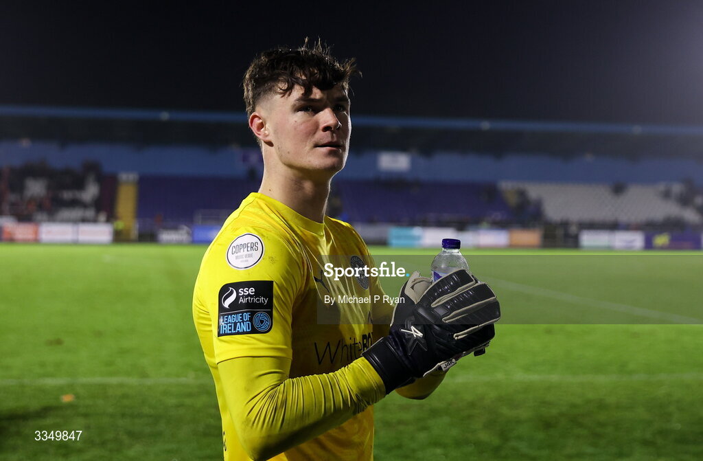 6 February 2026; Waterford goalkeeper Stephen McMullan acknowledges his side's supporters after the SSE Airtricity Men's Premier Division match between Waterford and Shelbourne at the Regional Sports Centre in Waterford. Photo by Michael P Ryan/Sportsfile
