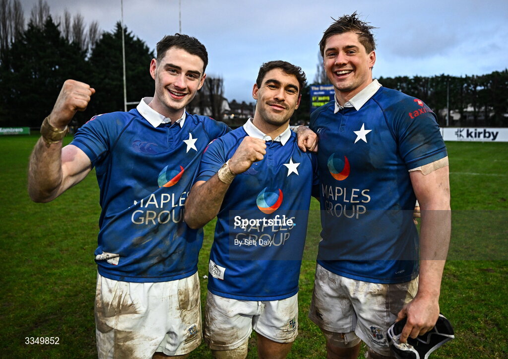 7 February 2026; St Mary's College players, from left, Ruairi Shields, Leo Ramirez and Josh Gimblett, after their side's victory in the Energia All-Ireland League Men's Division 1A match between St Mary's College and Terenure College at Templeville Road in Dublin. Photo by Seb Daly/Sportsfile