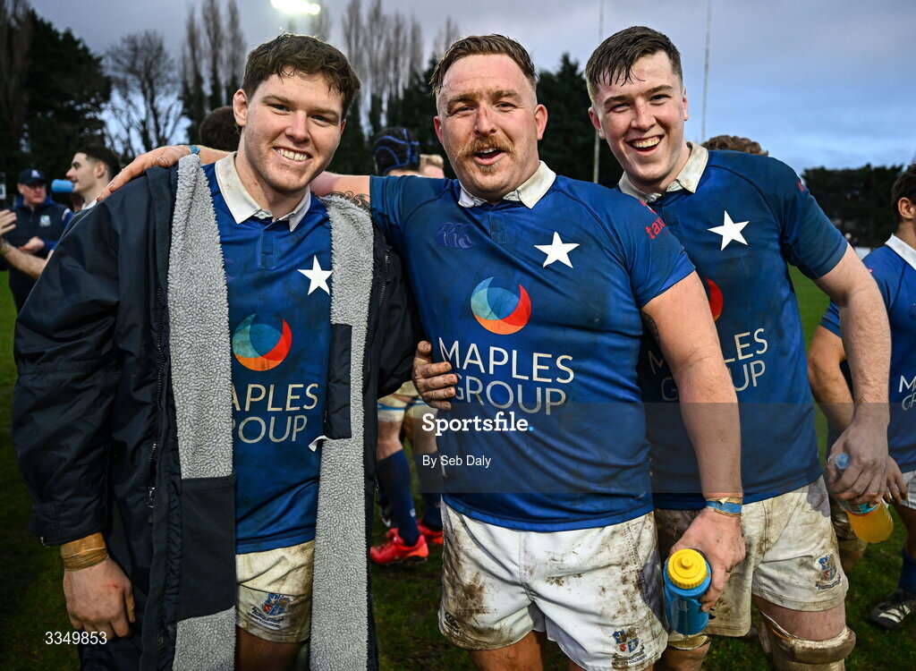 7 February 2026; St Mary's College players, from left, Oisin Michel, Tom O’Reilly, and Daniel Leane after their side's victory in the Energia All-Ireland League Men's Division 1A match between St Mary's College and Terenure College at Templeville Road in Dublin. Photo by Seb Daly/Sportsfile