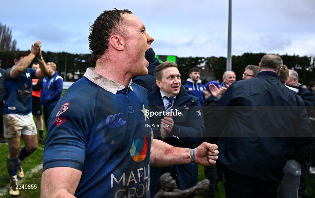 7 February 2026; St Mary's College captain Ronan Watters celebrates after his side's victory in the Energia All-Ireland League Men's Division 1A match between St Mary's College and Terenure College at Templeville Road in Dublin. Photo by Seb Daly/Sportsfile