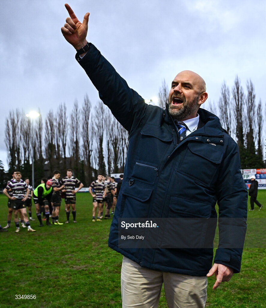 7 February 2026; St Mary's College RFC president Gareth Logan celebrates after his side's victory in the Energia All-Ireland League Men's Division 1A match between St Mary's College and Terenure College at Templeville Road in Dublin. Photo by Seb Daly/Sportsfile