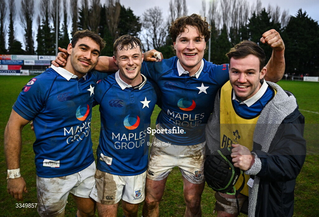 7 February 2026; St Mary's College players, from left, Leo Ramirez, Colm Reilly, Myles Carey, abnd Finn Burke celebrate after their side's victory in the Energia All-Ireland League Men's Division 1A match between St Mary's College and Terenure College at Templeville Road in Dublin. Photo by Seb Daly/Sportsfile