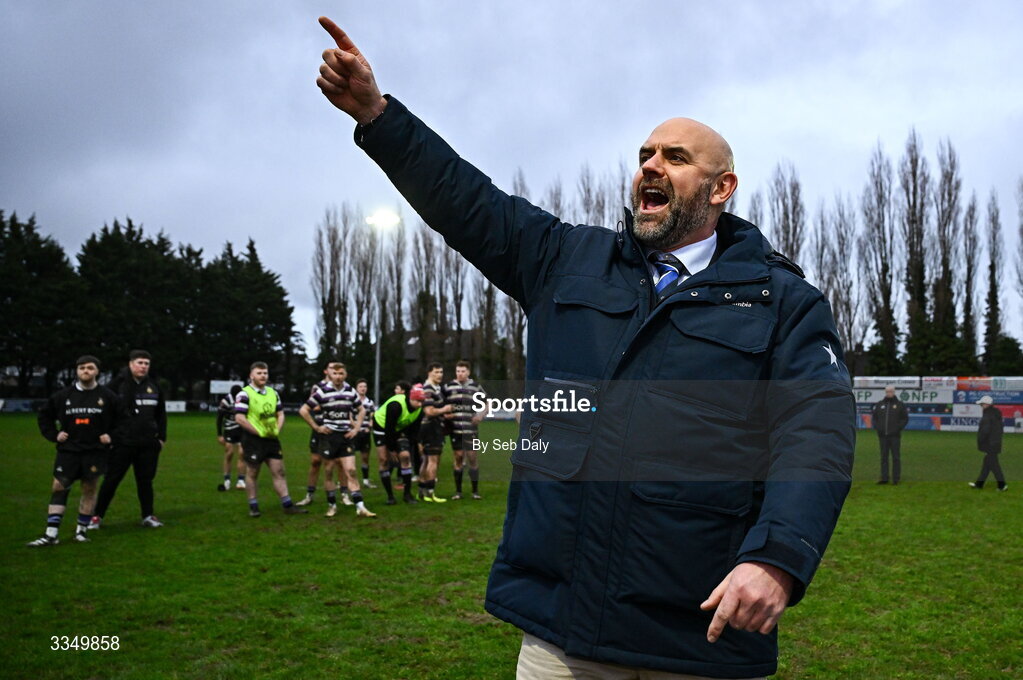 7 February 2026; St Mary's College RFC president Gareth Logan celebrates after his side's victory in the Energia All-Ireland League Men's Division 1A match between St Mary's College and Terenure College at Templeville Road in Dublin. Photo by Seb Daly/Sportsfile