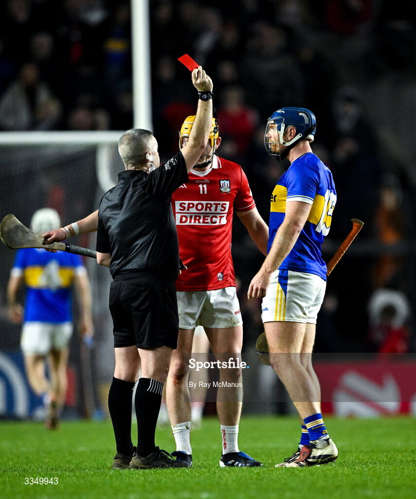 7 February 2026; Referee Liam Gordon issues a red card to Shane Barrett of Cork and Jason Forde of Tipperary, in the 40th minute, during the Allianz Hurling League Division 1A match between Cork and Tipperary at SuperValu Páirc Ui Chaoimh in Cork. Photo by Ray McManus/Sportsfile
