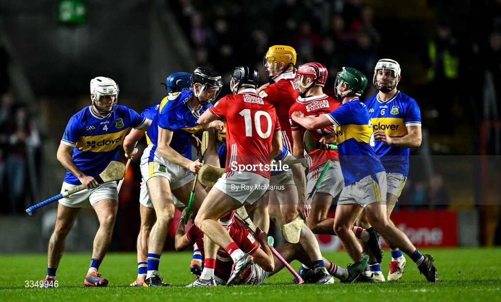 7 February 2026; Players of both sides jostle each other, just before half-time, during the Allianz Hurling League Division 1A match between Cork and Tipperary at SuperValu Páirc Ui Chaoimh in Cork. Photo by Ray McManus/Sportsfile
