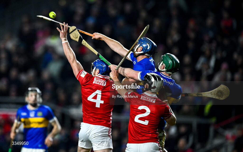 7 February 2026; Seán O'Donoghue of Cork wins possession ahead of his team mate Ger Millerick and Tipperary forwaeds Darragh Stekelum and Jason Forde during the Allianz Hurling League Division 1A match between Cork and Tipperary at SuperValu Páirc Ui Chaoimh in Cork. Photo by Ray McManus/Sportsfile