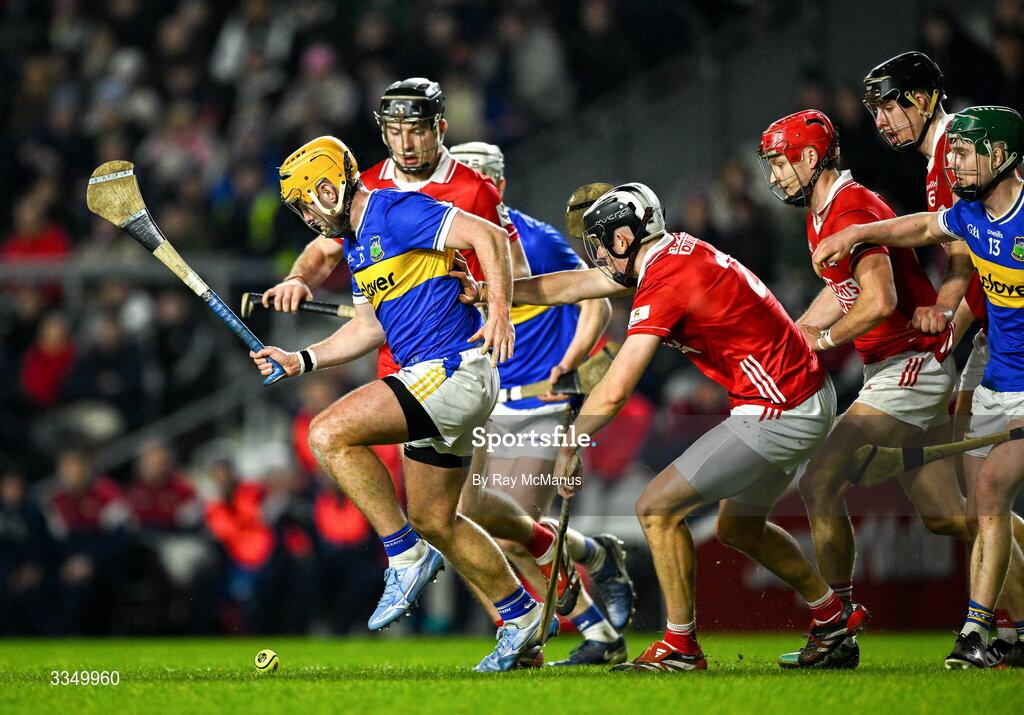 7 February 2026; Conor Stakekum of Tipperary is tackled by Eoín Downey and Ger Millerick of Cork during the Allianz Hurling League Division 1A match between Cork and Tipperary at SuperValu Páirc Ui Chaoimh in Cork. Photo by Ray McManus/Sportsfile