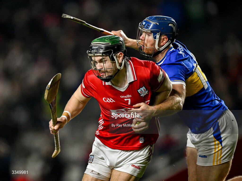 7 February 2026; Mark Coleman of Cork is tackled by Jason Forde of Tipperary during the Allianz Hurling League Division 1A match between Cork and Tipperary at SuperValu Páirc Ui Chaoimh in Cork. Photo by Ray McManus/Sportsfile