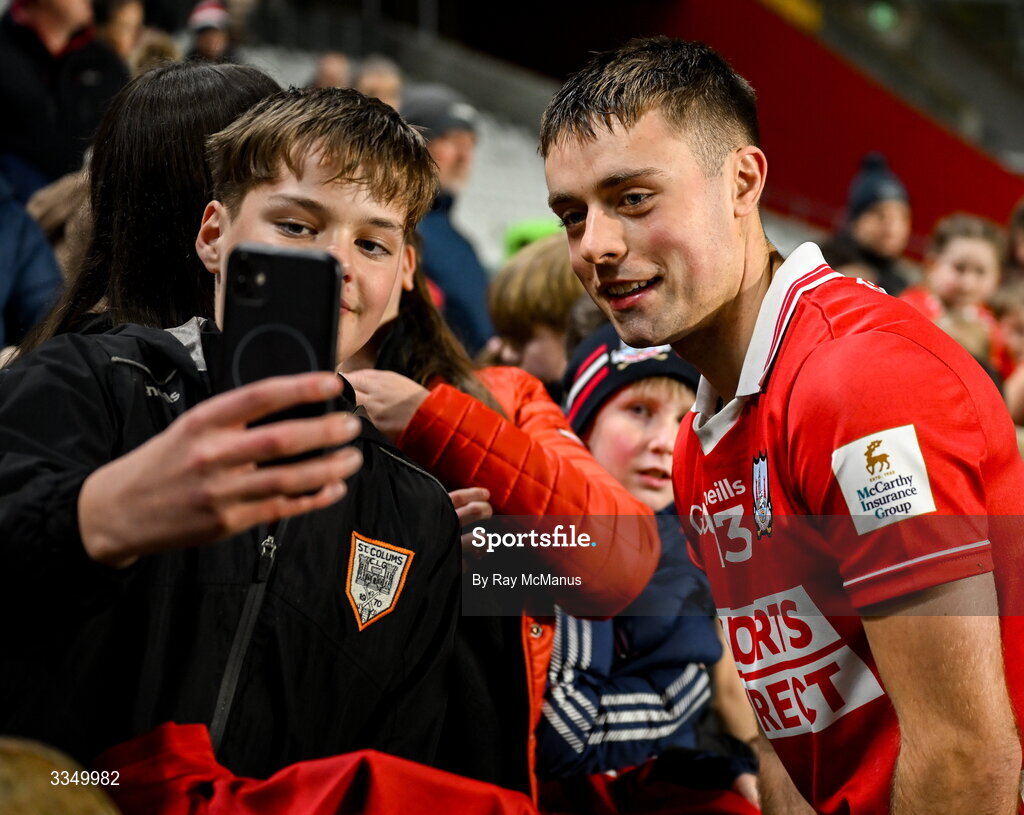 7 February 2026; William Buckley of Cork poses for a selfie with a young Cork supporter after the Allianz Hurling League Division 1A match between Cork and Tipperary at SuperValu Páirc Ui Chaoimh in Cork. Photo by Ray McManus/Sportsfile