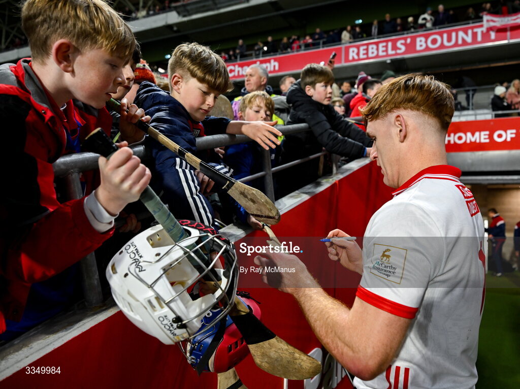 7 February 2026; Cork goalkeeper Patrick Collins signs autographs for a young Cork supporters after the Allianz Hurling League Division 1A match between Cork and Tipperary at SuperValu Páirc Ui Chaoimh in Cork. Photo by Ray McManus/Sportsfile