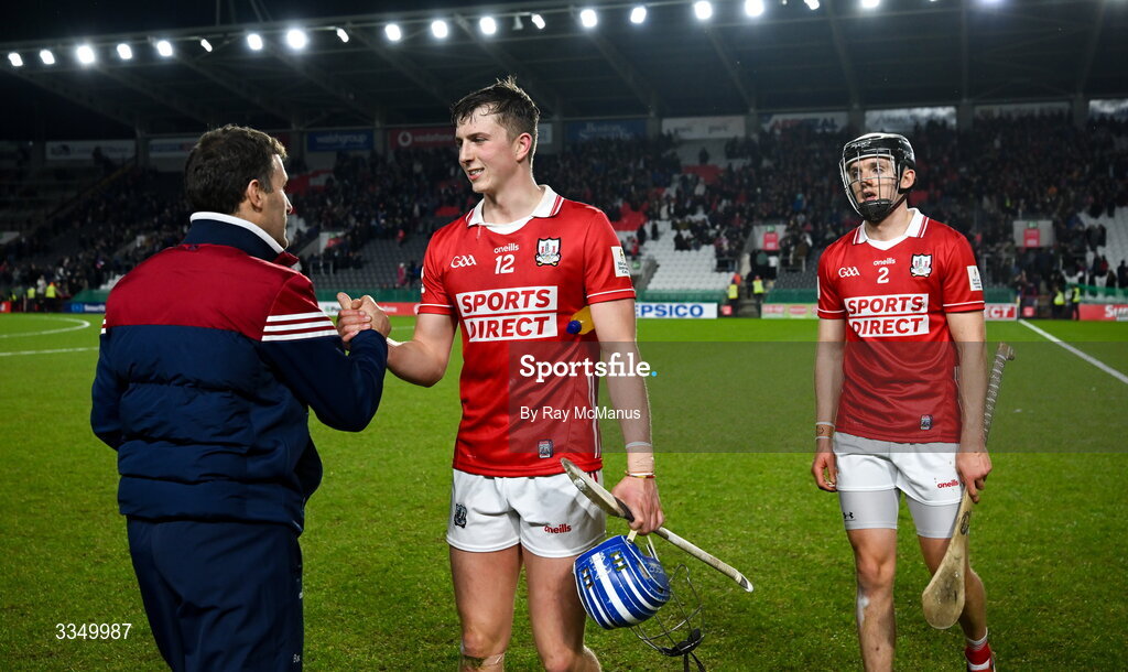 7 February 2026; Cork manager Ben O'Connor with Diarmuid Healy, 12, and Ger Millerick of Cork after the Allianz Hurling League Division 1A match between Cork and Tipperary at SuperValu Páirc Ui Chaoimh in Cork. Photo by Ray McManus/Sportsfile