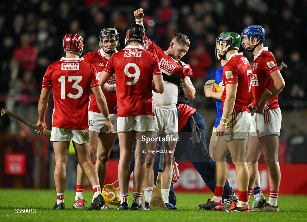 7 February 2026; Shane Barrett of Cork changes his jersey before he was issued with a red card during the Allianz Hurling League Division 1A match between Cork and Tipperary at SuperValu Páirc Ui Chaoimh in Cork. Photo by Ray McManus/Sportsfile