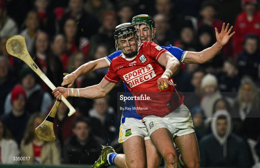 7 February 2026; Darragh Fitzgibbon of Cork is tackled by Sam O'Farrell of Tipperary during the Allianz Hurling League Division 1A match between Cork and Tipperary at SuperValu Páirc Ui Chaoimh in Cork. Photo by Ray McManus/Sportsfile