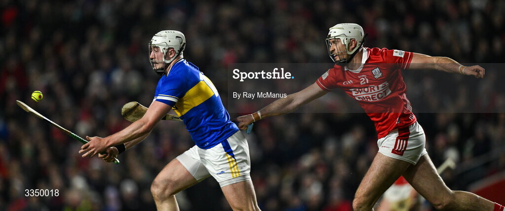 7 February 2026; Eoghan Connolly of Tipperary is tackled by Tim O'Mahony of Cork during the Allianz Hurling League Division 1A match between Cork and Tipperary at SuperValu Páirc Ui Chaoimh in Cork. Photo by Ray McManus/Sportsfile