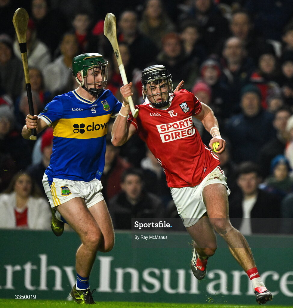 7 February 2026; Darragh Fitzgibbon of Cork is tackled by Sam O'Farrell of Tipperary during the Allianz Hurling League Division 1A match between Cork and Tipperary at SuperValu Páirc Ui Chaoimh in Cork. Photo by Ray McManus/Sportsfile