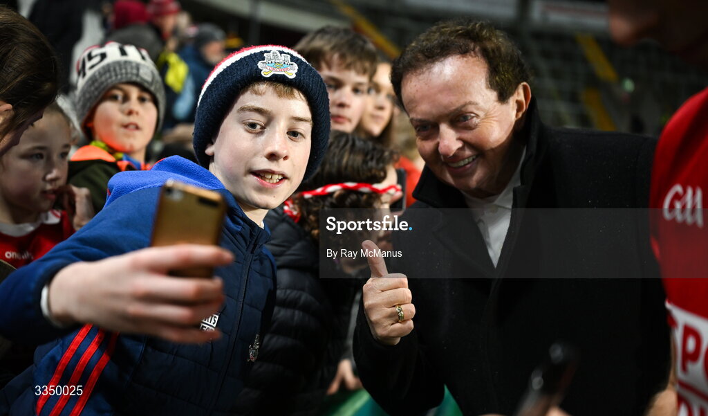 7 February 2026; A young Cork supporter get a selfie taken with Marty Morrisey of RTÉ, after the Allianz Hurling League Division 1A match between Cork and Tipperary at SuperValu Páirc Ui Chaoimh in Cork. Photo by Ray McManus/Sportsfile