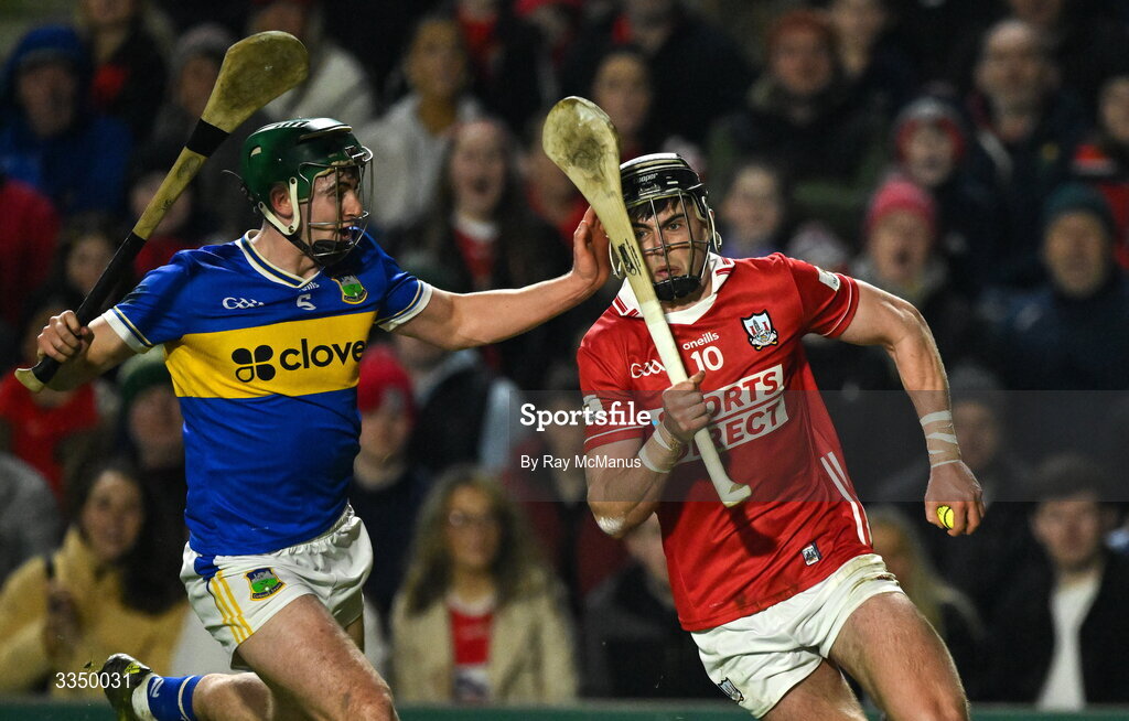 7 February 2026; Darragh Fitzgibbon of Cork is tackled by Sam O'Farrell of Tipperary during the Allianz Hurling League Division 1A match between Cork and Tipperary at SuperValu Páirc Ui Chaoimh in Cork. Photo by Ray McManus/Sportsfile