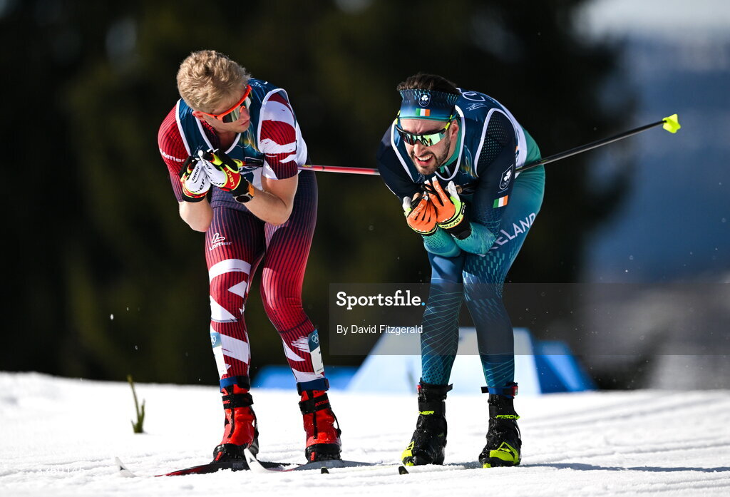 8 February 2026; Thomas Maloney Westgaard of Team Ireland, right, and Mika Vermeulen of Team Austria compete in the Men's Cross-Country Skiing 10km+10km Skiathlon Final during day two of the Milano Cortina 2026 Winter Olympics at Tesero Cross-Country Skiing Stadium in Val di Fiemme, Italy. Photo by David Fitzgerald/Sportsfile