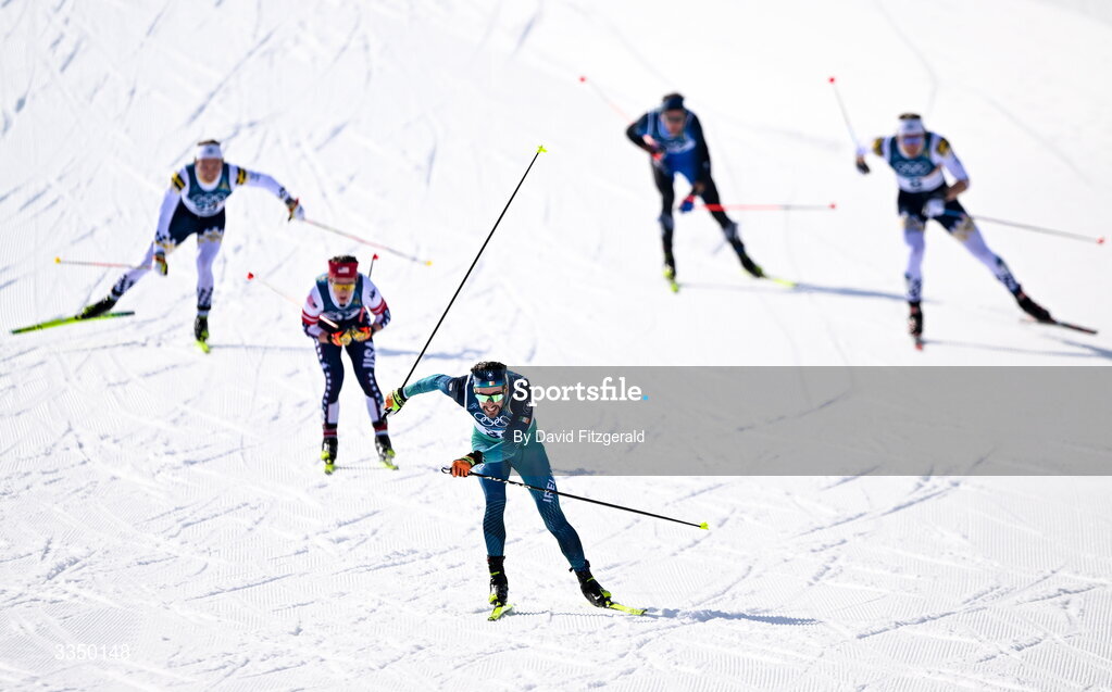 8 February 2026; Thomas Maloney Westgaard of Team Ireland, front, on his way to finishing the Men's Cross-Country Skiing 10km+10km Skiathlon Final during day two of the Milano Cortina 2026 Winter Olympics at Tesero Cross-Country Skiing Stadium in Val di Fiemme, Italy. Photo by David Fitzgerald/Sportsfile