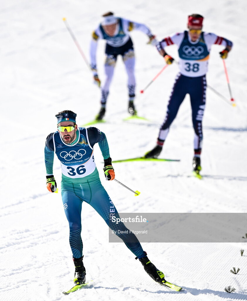 8 February 2026; Thomas Maloney Westgaard of Team Ireland, front, on his way to finishing the Men's Cross-Country Skiing 10km+10km Skiathlon Final during day two of the Milano Cortina 2026 Winter Olympics at Tesero Cross-Country Skiing Stadium in Val di Fiemme, Italy. Photo by David Fitzgerald/Sportsfile