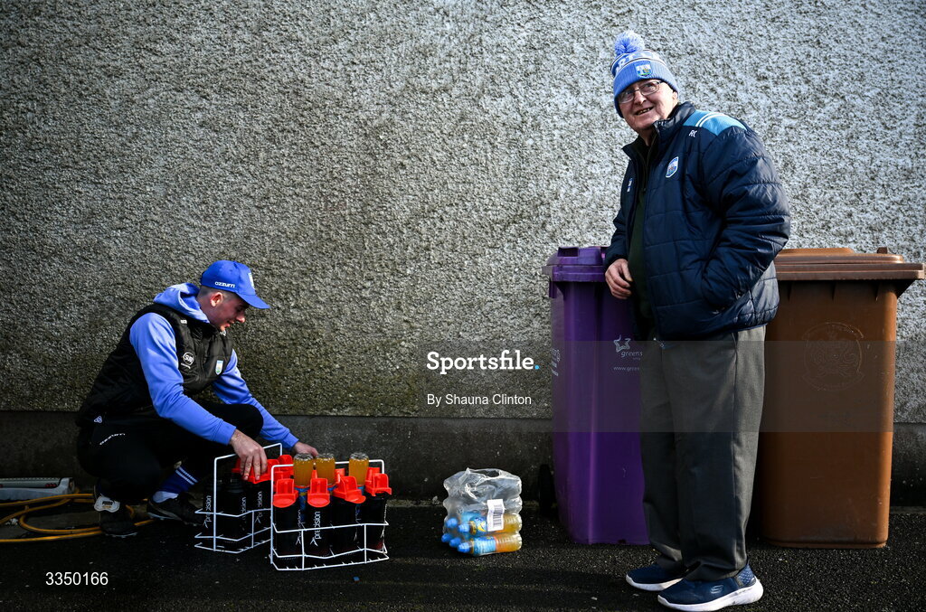 8 February 2026; Waterford supporter Roger Casey looks on as Waterford backroom staff member Richie Queally fills water bottles before the Allianz Hurling League Division 1A match between Waterford and Offaly at Azzuri Walsh Park in Waterford. Photo by Shauna Clinton/Sportsfile