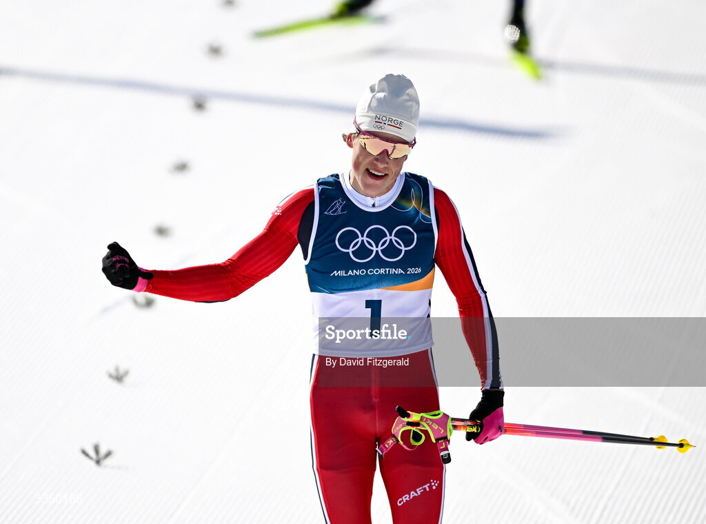 8 February 2026; Johannes Høsflot Klæbo of Team Norway celebrates on his way to winning the Men's Cross-Country Skiing 10km+10km Skiathlon Final during day two of the Milano Cortina 2026 Winter Olympics at Tesero Cross-Country Skiing Stadium in Val di Fiemme, Italy. Photo by David Fitzgerald/Sportsfile
