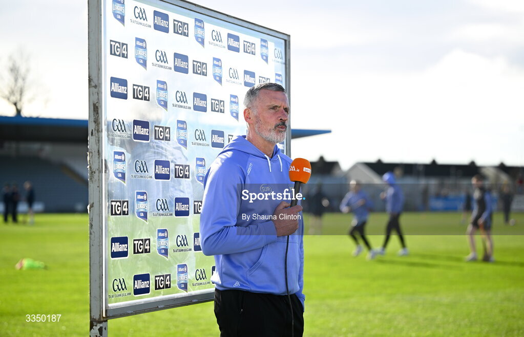 8 February 2026; Waterford manager Peter Queally is interviewed by TG4 ahead of the Allianz Hurling League Division 1A match between Waterford and Offaly at Azzuri Walsh Park in Waterford. Photo by Shauna Clinton/Sportsfile